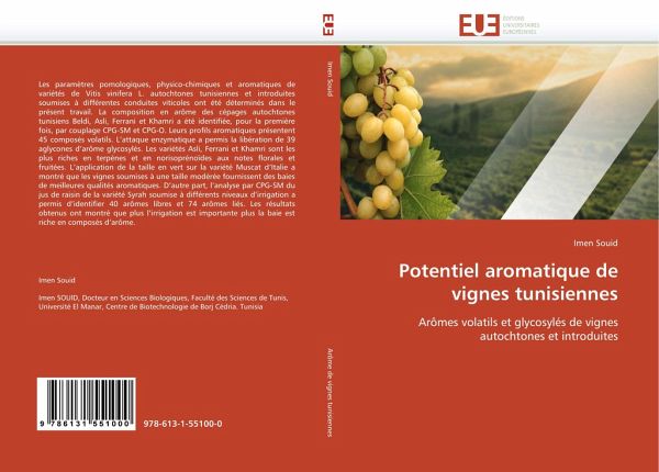 Les paramètres pomologiques, physico-chimiques et aromatiques de variétés de Vitis vinifera L. autochtones tunisiennes et introduites soumises à différentes conduites viticoles ont été déterminés dans le présent travail. La composition en arôme des cépages autochtones tunisiens Beldi, Asli, Ferrani et Khamri a été identifiée, pour la première fois, par couplage CPG-SM et CPG-O. Leurs profils aromatiques présentent 45 composés volatils. L'attaque enzymatique a permis la libération de 39 aglycones d'arôme glycosylés. Les variétés Asli, Ferrani et Khamri sont les plus riches en terpènes et en norisoprénoïdes aux notes florales et fruitées. L'application de la taille en vert sur la variété Muscat d'Italie a montré que les vignes soumises à une taille modérée fournissent des baies de meilleures qualités aromatiques. D'autre part, l'analyse par CPG-SM du jus de raisin de la variété Syrah soumise à différents niveaux d'irrigation a permis d'identifier 40 arômes libres et 74 arômes liés. Les résultats obtenus ont montré que plus l'irrigation est importante plus la baie est riche en composés d'arôme.
