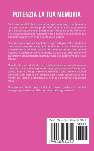 Hai mai desiderato ricordare nomi, informazioni o eventi importanti con facilità e totale sicurezza? La memoria è la chiave del successo in molti aspetti della vita. Con tecniche collaudate e strategie pratiche, questo libro ti guiderà a: rafforzare la concentrazione, migliorare la capacità di memorizzazione e aumentare la produttività. Attraverso esempi concreti, metodi innovativi e suggerimenti facili da applicare, scoprirai come allenare la tua mente per ottenere prestazioni mentali di alto livello. La tua memoria non sarà più un limite, ma il tuo più grande alleato! Immagina di memorizzare nuove informazioni con facilità, gestire la tua giornata senza stress e sentirti pienamente in controllo delle tue capacità mentali. Ogni capitolo rappresenta un passo concreto verso una versione migliore di te stesso. Cosa troverai in questo libro:Le basi del funzionamento della memoria: comprendi il tuo cervello per sfruttarlo al massimo. Tecniche pratiche di memorizzazione: dalle associazioni mentali alle mappe concettuali e molto altro. Strategie per aumentare la concentrazione: focus garantito in ogni situazione. Esercizi per allenare la mente: attività pratiche per migliorare rapidamente le tue capacità. Metodi per combattere lo stress mentale: libera la tua mente e rendila più efficiente. Non aspettare oltre. Scopri il potenziale nascosto della tua mente e diventa la persona che hai sempre sognato di essere. Ordina oggi "Potenzia la tua Memoria" e trasforma la tua vita con il potere della concentrazione e della memorizzazione!