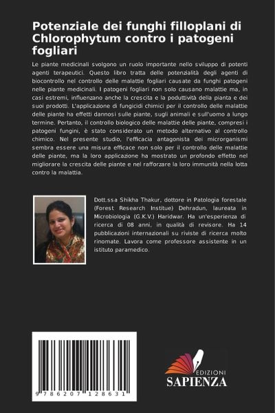 Le piante medicinali svolgono un ruolo importante nello sviluppo di potenti agenti terapeutici. Questo libro tratta delle potenzialità degli agenti di biocontrollo nel controllo delle malattie fogliari causate da funghi patogeni nelle piante medicinali. I patogeni fogliari non solo causano malattie ma, in casi estremi, influenzano anche la crescita e la poduttività della pianta e dei suoi prodotti. L'applicazione di fungicidi chimici per il controllo delle malattie delle piante ha effetti dannosi sulle piante, sugli animali e sull'uomo a lungo termine. Pertanto, il controllo biologico delle malattie delle piante, compresi i patogeni fungini, è stato considerato un metodo alternativo al controllo chimico. Nel presente studio, l'efficacia antagonista dei microrganismi sembra essere una misura efficace non solo per il controllo delle malattie delle piante, ma la loro applicazione ha mostrato un profondo effetto nel migliorare la crescita delle piante e nel rafforzare la loro immunità nella lotta contro la malattia.