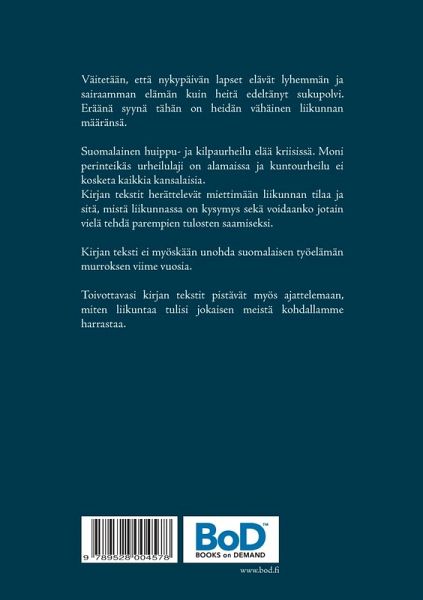 Väitetään, että nykypäivän lapset elävät lyhemmän ja sairaamman elämän kuin heitä edeltänyt sukupolvi. Eräänä syynä tähän on heidän vähäinen liikunnan määränsä. Suomalainen huippu- ja kilpaurheilu elää kriisissä. Moni perinteikäs urheilulaji on alamaissa ja kuntourheilu ei kosketa kaikkia kansalaisia. Kirjan tekstit herättelevät miettimään liikunnan tilaa ja sitä, mistä liikunnassa on kysymys sekä voidaanko jotain vielä tehdä parempien tulosten saamiseksi. Kirjan teksti ei myöskään unohda suomalaisen työelämän murroksen viime vuosia. Toivottavasi kirjan tekstit pistävät myös ajattelemaan, miten liikuntaa tulisi jokaisen meistä kohdallamme harrastaa.
