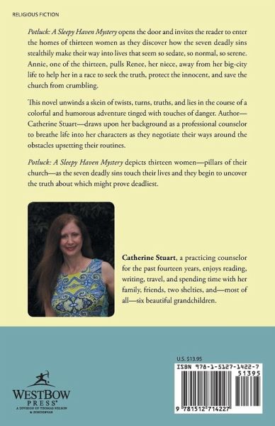 Potluck: A Sleepy Haven Mystery opens the door and invites the reader to enter the homes of thirteen women as they discover how the seven deadly sins stealthily make their way into lives that seem so sedate, so normal, so serene. Annie, one of the thirteen, pulls Renee, her niece, away from her big-city life to help her in a race to seek the truth, protect the innocent, and save the church from crumbling. This novel unwinds a skein of twists, turns, truths, and lies in the course of a colorful and humorous adventure tinged with touches of danger. Author-Catherine Stuart-draws upon her background as a professional counselor to breathe life into her characters as they negotiate their ways around the obstacles upsetting their routines. Potluck: A Sleepy Haven Mystery depicts thirteen women-pillars of their church-as the seven deadly sins touch their lives and they begin to uncover the truth about which might prove deadliest.