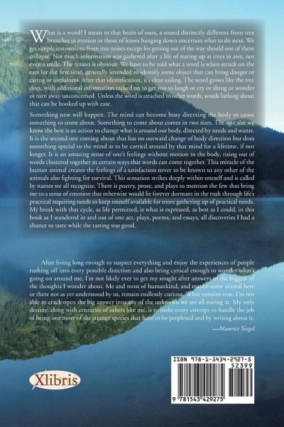 What is a word? I mean to that brain of ours, a sound distinctly different from tree branches in motion or those of leaves hanging down uncertain what to do next. We get simple instructions from tree noises except for getting out of the way should one of them collapse. Not much information was gathered after a life of staring up at trees in awe, not even a smile. The reason is obvious. We have to be told what a word is when struck on the ears for the first time, generally intended to identify some object that can bring danger or caring or usefulness. After that identification, it's clear sailing. The word grows like the tree does, with additional information tacked on to get you to laugh or cry or shrug or wonder or turn away unconcerned. Unless the word is attached to other words, words lurking about that can be hooked up with ease. Something new will happen. The mind can become busy directing the body to cause something to come about. Something to come about comes in two sizes. The one size we know the best is an action to change what is around our body, directed by needs and wants. It is the second one coming about that has no outward change of body direction but does something special to the mind as to be carried around by that mind for a lifetime, if not longer. It is an amazing sense of one's feelings without motion to the body, rising out of words clustered together in certain ways that words can come together. This miracle of the human animal creates the feelings of a satisfaction never to be known to any other of the animals also fighting for survival. This sensation strikes deeply within oneself and is called by names we all recognize. There is poetry, prose, and plays to mention the few that bring me to a sense of emotion that otherwise would lie forever dormant in the rush through life's practical requiring needs to keep oneself available for more gathering up of practical needs. My break with that cycle, as life permitted, is what is expressed, as best as I could, in this book as I wandered in and out of one act, plays, poems, and essays, all discoveries I had a chance to taste while the tasting was good.