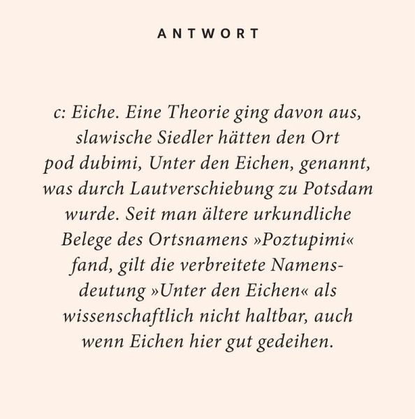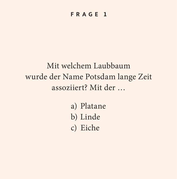 Potsdam, Residenz der preußischen Könige, bezaubert mit Schlössern, Kunstsammlungen, malerischen Gärten und Parks und einer einzigartigen Kulturlandschaft. Doch hinter der hoheitsvollen Kulisse lässt sich noch viel mehr entdecken: eine Stadt mit weltoffenem Flair und frappierenden Superlativen, die als wichtigster Wissenschaftsstandort Brandenburgs ebenso punktet wie mit dem größten Filmstudio Europas. 100 Fragen und Antworten laden zur spielerischen Erkundung ein!Stilvoll, elegant und immer eine gute Idee: Die Reihe "Quiz im Quadrat" präsentiert sich in modernem Design und sorgt für unterhaltsamen Rätselspaß - verpackt in einer edlen Geschenkbox. Perfekt als besondere 'Grußkarte' mit Mehrwert - zum Verschenken oder Selberfreuen!