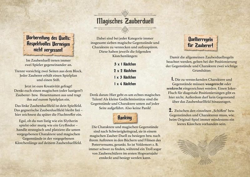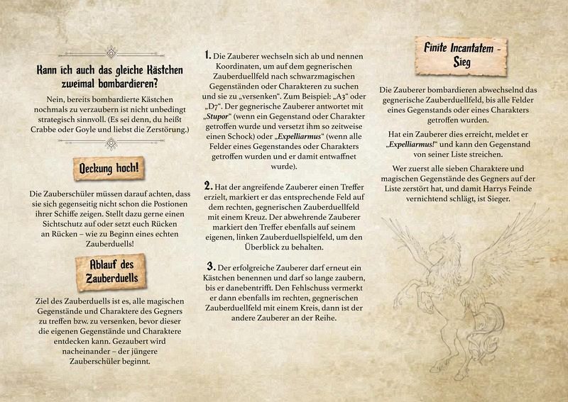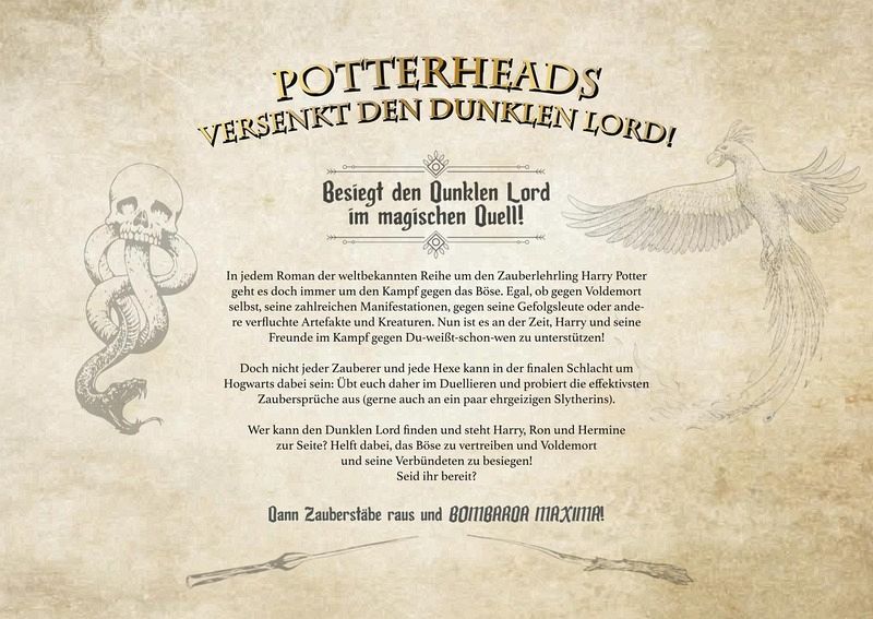 Du wolltest schon immer einmal mit Harry, Ron, Hermine & Co. gegen Du-weißt-schon-wen kämpfen? In der magischen Edition des Spieleklassikers Schiffe versenken hast jetzt du die Chance dazu! Seelenaussaugenden Dementoren, skrupellose Todesser und die bösesten Zauberer und Hexen aus dem Potterversum erwarten euch! Suche strategisch und messe dich mit deinen Freunden im ultimativen Zauber-Duell. Finde 140 magische Objekte, furchteinflößende Kreaturen und dunkle Feinde, die es zu verzaubern gilt. Kannst du die Horkruxe zerstören, die Schlacht um Hogwarts gewinnen und Lord Voldemort besiegen?
