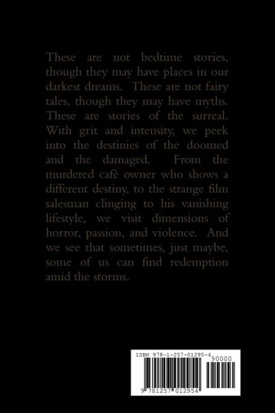 These are not bedtime stories, though they may have places in our darkest dreams. These are not fairy tales, though they may have myths. These are stories of the surreal. With grit and intensity, we peek into the destinies of the doomed and the damaged. From the murdered café owner who shows a different destiny, to the strange film salesman clinging to his vanishing lifestyle, we visit dimensions of horror, passion, and violence. And we see that sometimes, just maybe, some of us can find redemption amid the storms.