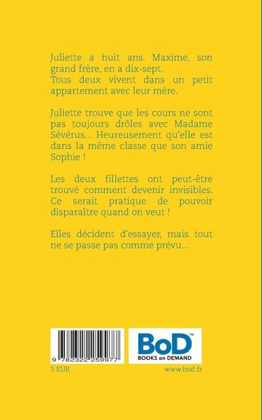 Juliette a huit ans. Maxime, son grand frère, en a dix-sept.Tous deux vivent dans un petit appartement avec leur mère.Juliette trouve que les cours ne sont pas toujours drôles avec Madame Sévérus... Heureusement qu'elle est dans la même classe que son amie Sophie !Les deux fillettes ont peut-être trouvé comment devenir invisibles. Ce serait pratique de pouvoir disparaître quand on veut !Elles décident d'essayer, mais tout ne se passe pas comme prévu...