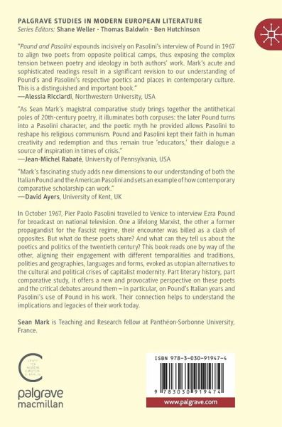 In October 1967, Pier Paolo Pasolini travelled to Venice to interview Ezra Pound for broadcast on national television. One a lifelong Marxist, the other a former propagandist for the Fascist regime, their encounter was billed as a clash of opposites. But what do these poets share? And what can they tell us about the poetics and politics of the twentieth century? This book reads one by way of the other, aligning their engagement with different temporalities and traditions, polities and geographies, languages and forms, evoked as utopian alternatives to the cultural and political crises of capitalist modernity. Part literary history, part comparative study, it offers a new and provocative perspective on these poets and the critical debates around them - in particular, on Pound's Italian years and Pasolini's use of Pound in his work. Their connection helps to understand the implications and legacies of their work today.