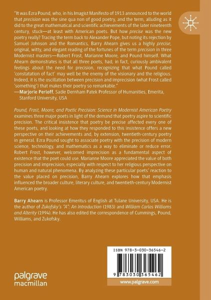 Pound, Frost, Moore and Poetic Precision: Science in American Modernist Poetry examines three major poets in light of the demand that poetry aspire to scientific precision. The critical insistence that poetry be precise affected every one of these poets, and looking at how they responded to this insistence offers a new perspective on their achievements and, by extension, twentieth-century poetry in general. Ezra Pound sought to associate poetry with the precision of modern science, technology and mathematics as a way to eliminate or reduce error. Robert Frost, however, welcomed imprecision as a fundamental aspect of existence that the poet could use. Marianne Moore appreciated the value of both precision and imprecision, especially with respect to her religious perspective on human and natural phenomena. By analyzing these particular poets' reaction to the value placed on precision, Barry Ahearn explores how that emphasis influenced the broader culture, literary culture andtwentieth-century Modernist American poetry.