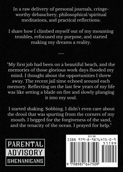 In a raw delivery of personal journals, cringe-worthy debauchery, philosophical/spiritual meditations, and practical reflections: I share how I climbed myself out of my mounting troubles, refocused my purpose, and started making my dreams a reality. --- "My first job had been on a beautiful beach, and the memories of those glorious work days flooded my mind. I thought about the opportunities I threw away. The recent jail time echoed around each memory. Reflecting on the last few years of my life was like setting a blade on fire and slowly plunging it into my soul. I started shaking. Sobbing. I didn't even care about the drool that was spurting from the corners of my mouth. I begged for the forgiveness of the sand, and the tenacity of the ocean. I prayed for help."