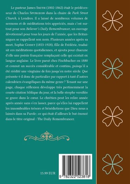 Le pasteur James Smith (1802-1862) était le prédécesseur de Charles Spurgeon dans la chaire de Park Street Church, à Londres. Il a laissé de nombreux volumes de sermons et de méditations très appréciés, mais c'est surtout pour son Believer's Daily Remembrancer}, un ouvrage dévotionnel pour tous les jours de l'année, que les Britanniques se rappellent son nom. Plusieurs années après sa mort, Sophie Godet (1853-1928), fille de Frédéric, traduisit ces méditations quotidiennes, et ajouta pour chacune d'elle une poésie française remplaçant celle qui existait en langue anglaise. Le livre parut chez Fischbacher en 1880 et connut un succès considérable et continu, puisqu'il a été réédité une vingtaine de fois jusqu'en notre siècle. Que présente-t-il donc de particulier par rapport à tant d'autres calendriers évangéliques du même genre ? Tenant sur une page, chaque réflexion développe très pertinemment la courte citation biblique du jour, et la belle strophe versifiée se grave dans le coeur. Le chrétien peut les relire année après année sans s'en lasser, parce qu'elles lui rappellent les innombrables trésors et bénédictions que Dieu nous a laissés dans sa Parole ; ce qui était d'ailleurs le but énoncé dans le titre original : The Daily Remembrancer. Cette édition ThéoTeX reproduit celle de 1880.