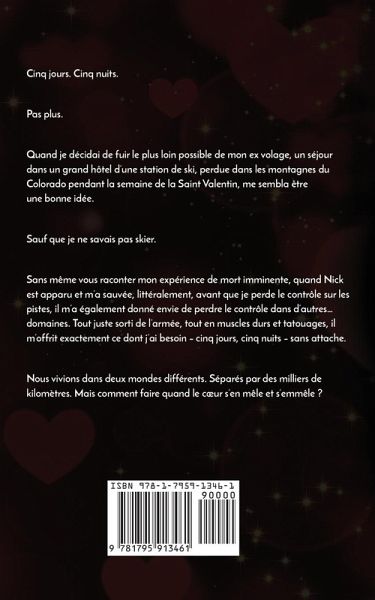 Cinq jours. Cinq nuits. Pas plus. Quand je décidai de fuir le plus loin possible de mon ex volage, un séjour dans un grand hôtel d'une station de ski, perdue dans les montagnes du Colorado pendant la semaine de la Saint Valentin, me sembla être une bonne idée. Sauf que je ne savais pas skier. Sans même vous raconter mon expérience de mort imminente, quand Nick est apparu et m'a sauvée, littéralement, avant que je perde le contrôle sur les pistes, il m'a également donné envie de perdre le contrôle dans d'autres... domaines. Tout juste sorti de l'armée, tout en muscles durs et tatouages, il m'offrit exactement ce dont j'ai besoin - cinq jours, cinq nuits - sans attache. Nous vivions dans deux mondes différents. Séparés par des milliers de kilomètres. Mais comment faire quand le cur s'en mêle et s'emmêle ?