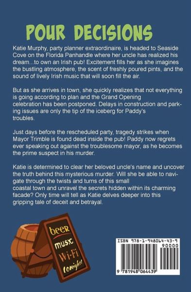 First in a new series from Suzanne Bolden! Katie Murphy, party planner extraordinaire, is headed to Seaside Cove on the Florida Panhandle where her uncle has realized his dream...to own an Irish pub! Excitement fills her as she imagines the bustling atmosphere, the scent of freshly poured pints, and the sound of lively Irish music that will soon fill the air. But as she arrives in town, she quickly realizes that not everything is going according to plan and the Grand Opening celebration has been postponed. Delays in construction and parking issues are only the tip of the iceberg for Paddy's troubles. Just days before the rescheduled party, tragedy strikes when Mayor Trimble is found dead inside the pub! Paddy now regrets ever speaking out against the troublesome mayor, as he becomes the prime suspect in his murder. Katie is determined to clear her beloved uncle's name and uncover the truth behind this mysterious murder. Will she be able to navigate through the twists and turns of this small coastal town and unravel the secrets hidden within its charming facade? Only time will tell as Katie delves deeper into this gripping tale of deceit and betrayal.