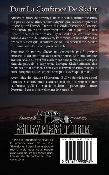 Ancien militaire de terrain, Carson Rhodes, surnommé Bull, n'a pas eu de relation sérieuse depuis que ses coéquipiers et lui ont quitté l'armée. Depuis, il a fondé Silverstone Towing, une façade pour son autre métier : tueur à gages. Quand l'institutrice d'école primaire Skylar Reid appelle au secours, coincée au bord de l'autoroute, l'attirance est immédiate. Le problème, c'est que la carrière de Bull l'a rendu blasé. Skylar est innocente et il tient à préserver cela. Prudente de nature, Skylar ne s'attendait pas à tomber amoureuse du chauffeur de sa dépanneuse. Et même lorsque Bull lui révèle ce qu'il fait réellement dans la vie, elle n'est pas sûre de pouvoir le supporter. Lorsque Skylar affronte des menaces qui n'ont rien à voir avec le travail de Bull, mais tout aussi dangereuses, les enjeux sont plus élevés que jamais. Avec l'aide de l'équipe Silverstone, Bull va devoir faire appel à toutes les compétences acquises au fil des ans pour ramener la femme qu'il aime à la maison - parce que l'autre éventualité est tout simplement impensable. ** Pour la confiance de Skylar est le premier tome de la série Silverstone. Il peut être lu séparément, mais nous vous recommandons de lire les tomes dans l'ordre afin de profiter au mieux de la série.