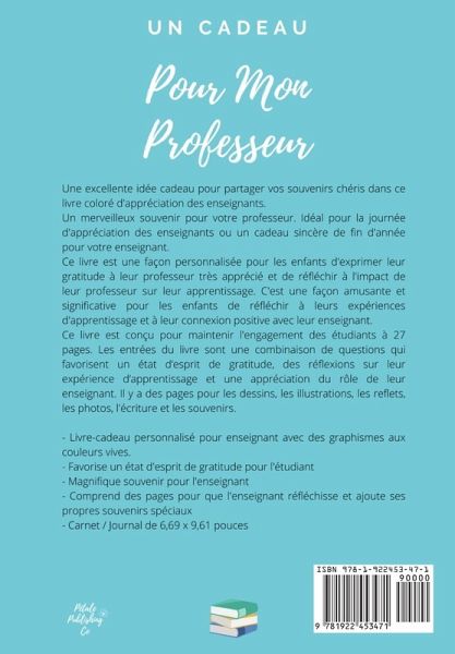 Une excellente idée cadeau pour partager vos souvenirs chéris dans ce livre coloré d'appréciation des enseignants. Un merveilleux souvenir pour votre professeur. Idéal pour la journée d'appréciation des enseignants ou un cadeau sincère de fin d'année pour votre enseignant. Ce livre est une façon personnalisée pour les enfants d'exprimer leur gratitude à leur professeur très apprécié et de réfléchir à l'impact de leur professeur sur leur apprentissage. C'est une façon amusante et significative pour les enfants de réfléchir à leurs expériences d'apprentissage et à leur connexion positive avec leur enseignant. Ce livre est conçu pour maintenir l'engagement des étudiants à 27 pages. Les entrées du livre sont une combinaison de questions qui favorisent un état d'esprit de gratitude, des réflexions sur leur expérience d'apprentissage et une appréciation du rôle de leur enseignant. Il y a des pages pour les dessins, les illustrations, les reflets, les photos, l'écriture et les souvenirs. - Livre-cadeau personnalisé pour enseignant avec des graphismes aux couleurs vives. - Favorise un état d'esprit de gratitude pour l'étudiant - Magnifique souvenir pour l'enseignant - Comprend des pages pour que l'enseignant réfléchisse et ajoute ses propres souvenirs spéciaux - Carnet / Journal de 6,69 x 9,61 pouces
