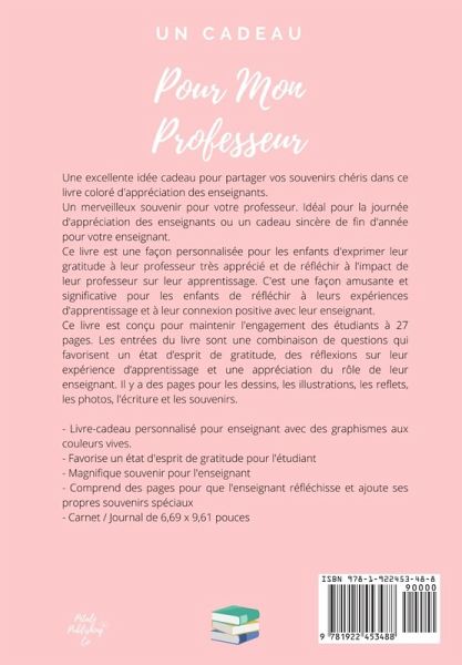 Une excellente idée cadeau pour partager vos souvenirs chéris dans ce livre coloré d'appréciation des enseignants. Un merveilleux souvenir pour votre professeur. Idéal pour la journée d'appréciation des enseignants ou un cadeau sincère de fin d'année pour votre enseignant. Ce livre est une façon personnalisée pour les enfants d'exprimer leur gratitude à leur professeur très apprécié et de réfléchir à l'impact de leur professeur sur leur apprentissage. C'est une façon amusante et significative pour les enfants de réfléchir à leurs expériences d'apprentissage et à leur connexion positive avec leur enseignant. Ce livre est conçu pour maintenir l'engagement des étudiants à 27 pages. Les entrées du livre sont une combinaison de questions qui favorisent un état d'esprit de gratitude, des réflexions sur leur expérience d'apprentissage et une appréciation du rôle de leur enseignant. Il y a des pages pour les dessins, les illustrations, les reflets, les photos, l'écriture et les souvenirs. - Livre-cadeau personnalisé pour enseignant avec des graphismes aux couleurs vives. - Favorise un état d'esprit de gratitude pour l'étudiant - Magnifique souvenir pour l'enseignant - Comprend des pages pour que l'enseignant réfléchisse et ajoute ses propres souvenirs spéciaux - Carnet / Journal de 6,69 x 9,61 pouces