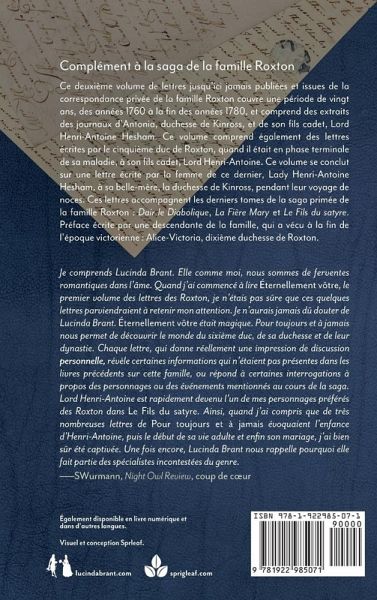 Ce deuxième volume de lettres jusqu'ici jamais publiées et issues de la correspondance privée de la famille Roxton couvre une période de vingt ans, des années 1760 à la fin des années 1780, et comprend des extraits des journaux d'Antonia, duchesse de Kinross, et de son fils cadet, Lord Henri-Antoine Hesham. Ce volume comprend également des lettres écrites par le cinquième duc de Roxton, quand il était en phase terminale de sa maladie, à son fils cadet, Lord Henri-Antoine. Ce volume se conclut sur une lettre écrite par la femme de ce dernier, Lady Henri-Antoine Hesham, à sa belle-mère, la duchesse de Kinross, pendant leur voyage de noces. Ces lettres accompagnent les derniers tomes de la saga primée de la famille Roxton : Dair le Diabolique, La Fière Mary et Le Fils du satyre. Préface écrite par une descendante de la famille, qui a vécu à la fin de l'époque victorienne : Alice-Victoria, dixième duchesse de Roxton.