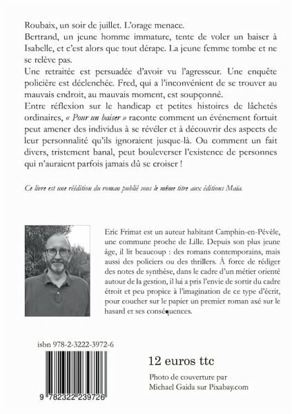 Roubaix, un soir de juillet. L'orage menace. Bertrand, un jeune homme immature, tente de voler un baiser à Isabelle, et c'est alors que tout dérape. La jeune femme tombe et ne se relève pas.Une retraitée est persuadée d'avoir vu l'agresseur. Une enquête policière est déclenchée. Fred, qui a l'inconvénient de se trouver au mauvais endroit, au mauvais moment, est soupçonné.Entre réflexion sur le handicap et petites histoires de lâchetés ordinaires,"Pour un baiser" raconte comment un événement fortuit peut amener des individus à se révéler et à découvrir des aspects de leur personnalité qu'ils ignoraient jusque-là. Ou comment un fait divers, tristement banal, peut bouleverser l'existence de personnes qui n'auraient parfois jamais dû se croiser !Ce livre est une réédition du roman publié sous le même titre aux éditions Maïa.