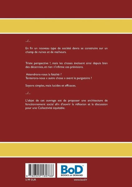 L'objet de cet ouvrage est de proposer une architecture de fonctionnement social afin d'ouvrir la réflexion et la discussion pour une Collectivité équitable.