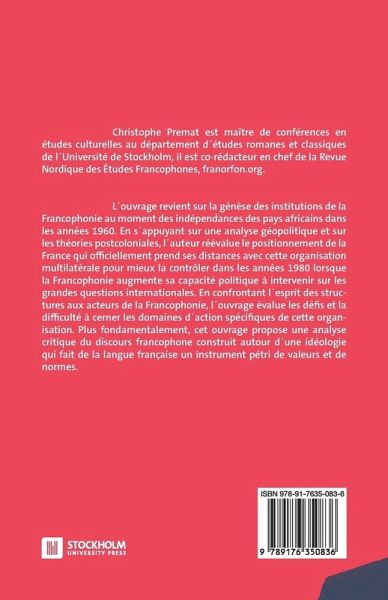 The book studies the genesis of the institutions of the Francophonie at the time of independence of African countries in the sixties. Based on geopolitical analysis and postcolonial theories, the author reassesses the position of France which officially distanced itself from this multilateral organization. France controlled more and more the organization in the 1980s when the organization increased its political expression on international issues. By confronting the spirit of the structures with the actors of the Francophonie, the work reflects on the challenges and the difficulty to define the specific fields of action of this organization. This book is in French: L´ouvrage se propose de revenir sur la génèse des institutions de la Francophonie au moment des indépendances des pays africains dans les années 1960. En s´appuyant sur une analyse géopolitique et sur les théories postcoloniales, l´auteur réévalue le positionnement de la France qui officiellement prend ses distances avec cette organisation multilatérale pour mieux la contrôler dans les années 1980 lorsque la Francophonie augmente sa capacité politique à intervenir sur les grandes questions internationales. En confrontant l´esprit des structures aux acteurs de la Francophonie, l´ouvrage évalue les défis et la difficulté à cerner les domaines d´action spécifiques de cette organisation.