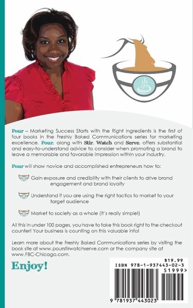 Pour - Marketing Success Starts With the Right Ingredients is the first of four books in the Freshly Baked Communications series for marketing excellence. Pour, along with Stir, Watch, and Serve, offers substantial and easy-to-understand advice to consider when promoting a brand to leave a memorable and favorable impression within your industry. Pour will show novice and accomplished entrepreneurs how to: --Gain exposure and credibility with their clients to drive brand engagement and brand loyalty --Understand if you are using the right tactics to market to your target audience --Market to society as a whole (it's really simple!)