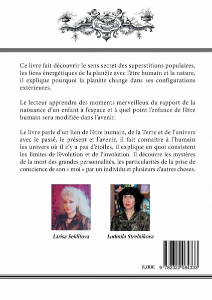 Ce livre fait découvrir le sens secret des superstitions populaires, les liens énergétiques de la planète avec l'être humain et la nature, il explique pourquoi la planète change dans ses configurations extérieures. Le lecteur apprendra des moments merveilleux du rapport de la naissance d'un enfant à l'espace et à quel point l'enfant de l'être humain sera modifiée dans l'avenir.Le livre parle d'un lien de l'être humain; de la Terre et l'univers avec le passé, le présent, et l'avenir, il fait connaître à l'humain les univers où il n'y a pas d'étoiles, il explique en quoi consistent les limites de l'évolution et de l'involution. Il découvre les mystères de la mort des grandes personnalités, les particularités de la prise de conscience de son « moi » par un individu et plusieurs d'autres choses.