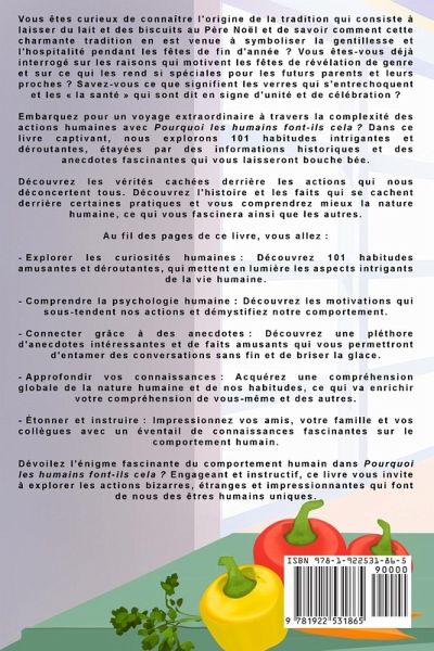 Vous êtes curieux de connaître l'origine de la tradition qui consiste à laisser du lait et des biscuits au Père Noël et de savoir comment cette charmante tradition en est venue à symboliser la gentillesse et l'hospitalité pendant les fêtes de fin d'année ? Vous êtes-vous déjà interrogé sur les raisons qui motivent les fêtes de révélation de genre et sur ce qui les rend si spéciales pour les futurs parents et leurs proches ? Savez-vous ce que signifient les verres qui s'entrechoquent et les à la santé qui sont dit en signe d'unité et de célébration ? Embarquez pour un voyage extraordinaire à travers la complexité des actions humaines avec Pourquoi les humains font-ils cela ? Dans ce livre captivant, nous explorons 101 habitudes intrigantes et déroutantes, étayées par des informations historiques et des anecdotes fascinantes qui vous laisseront bouche bée. Découvrez les vérités cachées derrière les actions qui nous déconcertent tous. Découvrez l'histoire et les faits qui se cachent derrière certaines pratiques et vous comprendrez mieux la nature humaine, ce qui vous fascinera ainsi que les autres. Au fil des pages de ce livre, vous allez : Explorer les curiosités humaines : Découvrez 101 habitudes amusantes et déroutantes, qui mettent en lumière les aspects intrigants de la vie humaine. Comprendre la psychologie humaine : Découvrez les motivations qui sous-tendent nos actions et démystifiez notre comportement. Connecter grâce à des anecdotes : Découvrez une pléthore d'anecdotes intéressantes et de faits amusants qui vous permettront d'entamer des conversations sans fin et de briser la glace. Approfondir vos connaissances : Acquérez une compréhension globale de la nature humaine et de nos habitudes, ce qui va enrichir votre compréhension de vous-même et des autres. Étonner et instruire : Impressionnez vos amis, votre famille et vos collègues avec un éventail de connaissances fascinantes sur le comportement humain. Dévoilez l'énigme fascinante du comportement humain dans Pourquoi les humains font-ils cela ? Engageant et instructif, ce livre vous invite à explorer les actions bizarres, étranges et impressionnantes qui font de nous des êtres humains uniques.