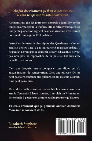 Cela fait des rotations qu'il est à mes trousses. Il était temps que les rôles s'inversent. Ashmara sait que ses jours sont comptés quand Sky envoie toute son armée pour la traquer. Elle se retrouve bloquée sur une petite planète où règnent beauté et violence, avec Jerrock pour seul compagnon. Et il la déteste. Jerrock est le tueur le plus réputé des Quadrants - c'est un assassin de Sky. Il ne l'a pas toujours été, mais aujourd'hui, il ne peut et ne veut pas se souvenir de sa vie d'avant. Il ne veut pas non plus se rapprocher de la pilleuse Eshmiri avec laquelle il est coincé. C'est une droguée, une alcoolique et une idiote, qui n'a aucun instinct de conservation. C'est une pilleuse. On ne peut pas faire confance aux pilleurs. Et lui, il est un assassin. Il ne peut pas aimer. Mais alors qu'ils traversent ensemble le cosmos avec une armée d'assassins à leurs trousses, il est clair qu'Ashmara est déterminée à percer son armure et à lui prouver qu'il a tort. Tu crois vraiment que je pourrais oublier Ashmara ? Mon âme se souvient de toi. __________ Poursuivie par le Cyborg de Skyest le fin de la série - pour le moment - il y a aussi deux novellas y inclus dans la saga Passion Xiveri, mais ceci et la grande Xiveri conclusion ! Tous les livres dans la série font la part belle à la mixité et les mondes présentés sont tous différents. En outre, les intrigues amoureuses, passionnées, destinées à un public adulte, ont toutes une fin heureuse.