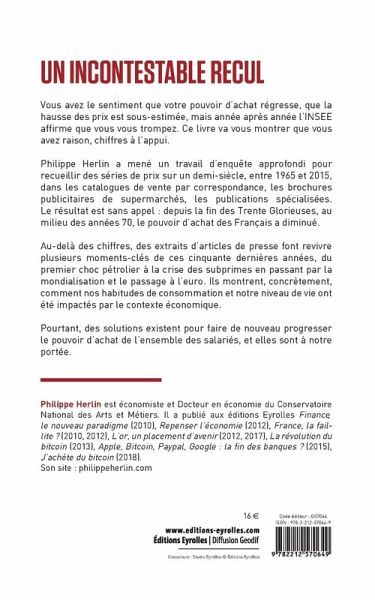 UN INCONTESTABLE RECULVous avez le sentiment que votre pouvoir d'achat régresse, que la hausse des prix est sous-estimée, mais année après année l'INSEE affirme que vous vous trompez. Ce livre va vous montrer que vous avez raison, chiffres à l'appui.Philippe Herlin a mené un travail d'enquête approfondi pour recueillir des séries de prix sur un demi-siècle, entre 1965 et 2015, dans les catalogues de vente par correspondance, les brochures publicitaires de supermarchés, les publications spécialisées. Le résultat est sans appel: depuis la fin des Trente Glorieuses, au milieu des années 70, le pouvoir d'achat des Français a diminué.Au-delà des chiffres, des extraits d'articles de presse font revivre plusieurs moments-clés de ces cinquante dernières années, du premier choc pétrolier à la crise des subprimes en passant par la mondialisation et le passage à l'euro. Ils montrent, concrètement, comment nos habitudes de consommation et notre niveau de vie ont été impactés par le contexte économique.Pourtant, des solutions existent pour faire de nouveau progresser le pouvoir d'achat de l'ensemble des salariés, et elles sont à notre portée.