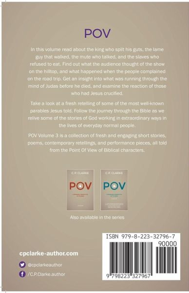 Bible stories are often told with a straight retelling of the scriptural text with very little emotion or motive emphasising what the story is trying to convey - the very real personal story contained with. Volume Three sees even more stories come to life, expanding on the emotions and motives of some well-known characters in the Bible. In this volume read about the king who spilt his guts, the lame guy that walked, the mute who talked, and the slaves who refused to eat. Find out what the audience thought of the show on the hilltop, and what happened when the people complained on the road trip. Get an insight into what was running through the mind of Judas before he died, and examine the reaction of those who had Jesus crucified. Take a look at a fresh retelling of some of the most well-known parables Jesus told. Follow the journey through the Bible as we relive some of the stories of God working in extraordinary ways in the lives of everyday normal people. P.O.V. Volume 3 is a collection of fresh and engaging short stories, poems, contemporary retellings, and performance pieces, all told from the Point Of View of Biblical characters. 'C. P. Clarke has a good eye for detail and a great turn of phrase. I recommend these retelling of Bible stories, both the more familiar and the less.' Andrew Watson, Bishop of Guildford