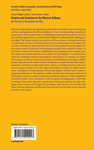 This book maps the latest developments in the policy relevant analysis on poverty, inclusion and the social agenda in the Western Balkans. It does so by presenting a selection of recent papers which explore from a methodological and analytical point of view how the inclusion agenda can be monitored and adapted to understand the challenges in the region. The volume includes an overview and four sections, covering respectively: (1) innovations in terms of measurement of poverty and inclusion in the region (the concept of inclusion as elaborated at the EU level, innovations in survey design to suit the measurement of inclusion, methodological insights from qualitative work); (2) innovative country level analysis (updating poverty mapping in inter-censual years, the analysis of material deprivation, the analysis of determinants of social inclusion, subjective wellbeing of public work programs participants); (3) examples of country level analysis of drivers of exclusion (barriers to formalization in the labour market, gender disparities in the labour market, disruption in social networks following urbanizations, attitudes towards multi-ethnic states); (4) building inclusive safety nets (an assessment of safety nets in the region, the political economy of welfare reform, micro-simulations of social assistance reform, the adoption of better tools to improve targeting performance). The chapters combine sophisticated techniques which are at the frontiers of poverty analysis (small area estimation, efficiency analysis applied to household welfare, micro-simulations) with less ground-breaking papers which take advantage of innovative datasets or perspectives deeply grounded in the policy dialogue in the countries of the region. By providing a wide spectrum of innovative and policy relevant analytical contributions this book will be of broader interest than for observers of the region.