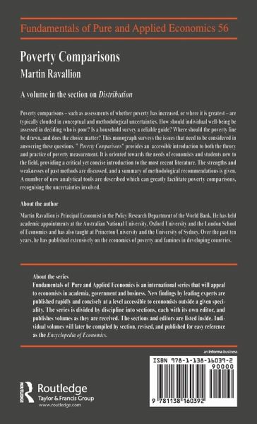 First published in 1994. Drawing on a personal network, an economist can still relatively easily stay well informed in the narrow field in which he works, but to keep up with the development of economics as a whole is a much more formidable challenge. Economics are confronted with difficulties associated with the rapid development of their discipline. There is a risk of 'balkanization' in economics, which may not be favorable to its development. Fundamentals of Pure and Applied Economics has been created to meet this problem. Poverty comparisons - such as assessments of whether poverty has increased, or where it is greatest - are typically clouded in conceptual and methodological uncertainties. How should individual4 well-being' be assessed in deciding who is poor? Is a household survey a reliable guide? Where should the poverty line be drawn, and does the choice matter? What poverty measure should be used in aggregating data on individual well-being? Does that choice matter? This monograph surveys the issues that need to be considered in answering these questions.