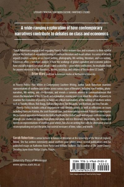Representations of southern poor whites have long shifted between romanticization and demonization. At worst, poor southern whites are aligned with racism, bigotry, and right-wing extremism, and, at best, regarded as the passive victims of wider, socioeconomic policies. In Poverty Politics: Poor Whites in Contemporary Southern Writing, author Sarah Robertson pushes beyond these stereotypes and explores the impact of neoliberalism and welfare reform on depictions of poverty. Robertson examines representations of southern poor whites across various types of literature, including travel writing, photo-narratives, life-writing, and eco-literature, and reveals a common interest in communitarianism that crosses the boundaries of the US South and regionalism, moving past ideas about the culture of poverty to examine the economics of poverty. Included are critical examinations of the writings of southern writers such as Dorothy Allison, Rick Bragg, Barbara Kingsolver, Tim McLaurin, Toni Morrison, and Ann Pancake. Poverty Politics includes critical engagement with identity politics as well as reflections on issues including Hurricane Katrina, the 2008 financial crisis, and mountaintop removal. Robertson interrogates the presumed opposition between the Global North and the Global South and engages with microregions through case studies on Appalachian photo-narratives and eco-literature. Importantly, she focuses not merely on representations of southern poor whites, but also on writing that calls for alternative ways of reconceptualizing not just the poor, but societal measures of time, value, and worth.