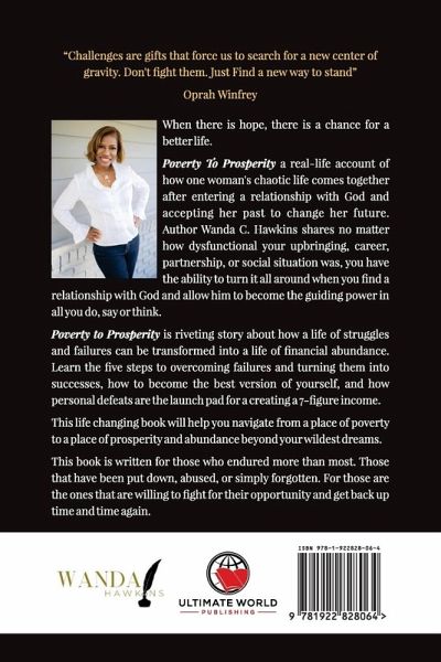 "Challenges are gifts that force us to search for a new center of gravity. Don't fight them. Just Find a new way to stand" Oprah Winfrey When there is hope, there is a chance for a better life. Poverty To Prosperity is a real-life account of how one woman's chaotic life comes together after entering a relationship with God and accepting her past to change her future. Author Wanda C. Hawkins shares no matter how dysfunctional your upbringing, career, partnership, or social situation was, you have the ability to turn it all around when you find a relationship with God and allow him to become the guiding power in all you do, say or think. Poverty to Prosperity is a riveting story about how a life of struggles and failures can be transformed into a life of financial abundance. Learn the five steps to overcoming failures and turning them into successes, how to become the best version of yourself, and how personal defeats are the launch pad for a creating a 7-figure income. This life-changing book will help you navigate from a place of poverty to a place of prosperity and abundance beyond your wildest dreams. This book is written for those who endured more than most. Those that have been put down, abused, or simply forgotten. For those are the ones that are willing to fight for their opportunity and get back up time and time again.