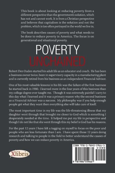 This book is about looking at reducing poverty from a different perspective than the government's solution, which has not and cannot work. It is from a Christian perspective and believes that capitalism is the solution and not the problem, which is too often portrayed in the world we live in. The book describes causes of poverty and what needs to be done to reduce poverty in America. The focus is on generational and situational poverty.