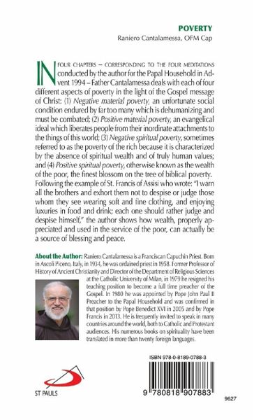 In four chapters Father Cantalamessa deals with each of four different aspects of poverty in the light of the Gospel message of Christ: Negative material poverty, an unfortunate social condition endured by far too many which is dehumanizing and must be combated; Positive material poverty, an evangelical ideal which liberates people from their inordinate attachments to the things of this world; Negative spiritual poverty, sometimes referred to as the poverty of the rich because it is characterized by the absence of spiritual wealth and of truly human values; and Positive spiritual poverty, otherwise known as the wealth of the poor, the finest blossom on the tree of biblical poverty. Following the example of St. Francis of Assisi the author shows how wealth, properly appreciated and used in the service of the poor, can actually be a source of blessing and peace.