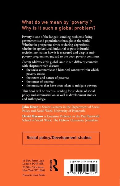 This book addresses the long-standing global issue of poverty. An introductory chapter explores concepts and definitions of poverty, the subsequent chapters providing detailed examinations of poverty in ten different countries: UK, USA, Australia, Canada, Hong Kong, Ireland, Malta, The Netherlands, The Philippines and Zimbabwe. Each chapter follows a consistent format, to facilitate comparison and focuses on the following issues:- * the socio-economic and historical context within which poverty exists * the extent and nature of poverty its causes * the measures that have been taken to mitigate it. This book will be essential reading for students of social policy and administration as well as development studies and anthropology.