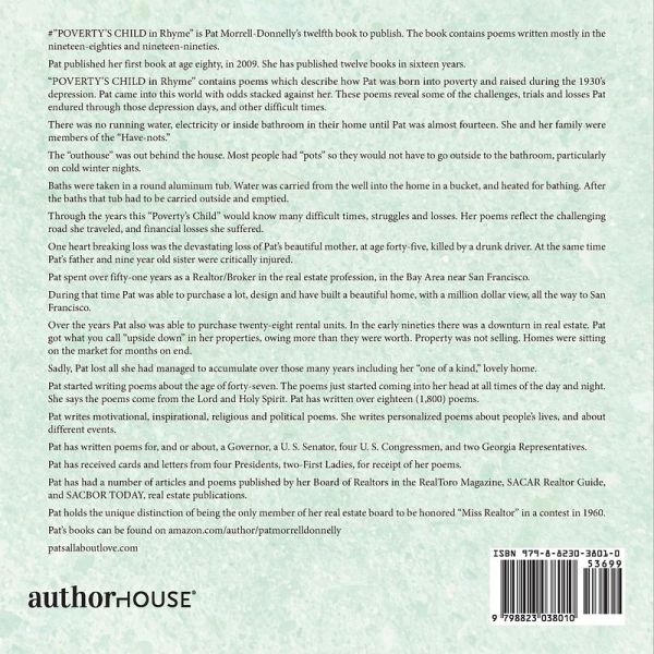 "POVERTY'S CHILD in Rhyme" is Pat Morrell-Donnelly's twelfth (12th) book to publish. The book contains poems written mostly in the nineteen-eighties and nineties. Pat published her first book at age eighty in 2009. She has published twelve books in sixteen years. "POVERTY'S CHILD in Rhyme" contains poems which describe how Pat was born into poverty and raised during the 1930's depression. Pat came into this world with odds stacked against her. These poems reveal some of the challenges, trials and losses Pat endured through those depression days, and other difficult times. There was no running water, electricity or inside bathroom in their home until Pat was almost fourteen. She and her family were members of the "Have Not's." The "outhouse" was out behind the house. Most people had "pots" so they would not have to go outside to the bathroom, particularly on cold winter nights. Baths were taken in a round aluminum tub. Water was carried from the well into the home in a bucket, and heated for bathing. After the baths that tub had to be carried outside and emptied. Through the years this "Poverty's Child" would know many difficult times, struggles and losses. Her poems reflect the challenging road she traveled, and financial losses she suffered. One heart breaking loss was the devastating loss of Pat's beautiful mother, at age forty-five, killed by a drunk driver. At the same time Pat's father and nine year old sister were critically injured. Pat spent over fifty-one years as a Realtor/Broker in the real estate profession, in the Bay Area near San Francisco. During that time Pat was able to purchase a lot, design and have built a beautiful home, with a million dollar view, all the way to San Francisco. Over the years Pat also was able to purchase twenty-eight rental units. In the early nineties there was a downturn in real estate. Pat got what you call "upside down" in her properties, owing more than they were worth. Property was not selling. Homes were sitting on the market for months on end. Sadly, Pat lost all she had managed to accumulate over those many years including her "one of a kind," lovely home. Pat started writing poems about the age of forty-seven. The poems just started coming into her head at all times of the day and night. She says the poems come from the Lord and Holy Spirit. Pat has written over eighteen (1,800) poems. Pat writes motivational, inspirational, religious and political poems. She writes personalized poems about people's lives, and about different events. Pat has written poems for, and or about, a Governor, a U. S. Senator, four U. S. Congressmen, and two Georgia Representatives. Pat has received cards and letters from four Presidents, and two-First Ladies, for receipt of her poems. Pat has had a number of articles and poems published by her Board of Realtors in the RealToro Magazine, SACAR Realtor Guide, and SACBOR TODAY, real estate publications. Pat holds the unique distinction of being the only member of her real estate board to be honored "Miss Realtor" in a contest in 1960.