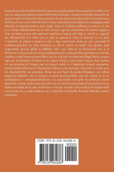De¿ertul nu uit¿ niciodat¿.Vântul î¿i poart¿ ¿oaptele printre dune,p¿strând ecourile celor care au c¿lcat acest p¿mânt înainte.Sub bolta nesfâr¿it¿ a cerului înstelat,fiii nisipurilor î¿i spun pove¿tile la lumina focului,iar printre ele,una r¿sun¿ mai presus decât toate,povestea lui Ietur,cel care a unit triburile.Într-o vreme când de¿ertul era sfâ¿iat de neîn¿elegeri,când triburile î¿i m¿surau puterea prin sânge v¿rsat ¿i rivalit¿¿i nesfâr¿ite,s-a n¿scut un om cu o viziune diferit¿.Ietur nu era fiul vreunui rege,nici mo¿tenitor al vreunei bog¿¿ii,ci doar un tân¿r crescut sub asprimea soarelui,cu nisipul sub t¿lpi ¿i vântul ca singurul s¿u sf¿tuitor.Dar el a v¿zut ceea ce al¿ii nu puteau.A v¿zut c¿ de¿ertul nu era doar o întindere de piatr¿ ¿i nisip,ci o cale ce lega oamenii,un drum pe care caravanele îl str¿b¿teau,purtând nu doar m¿rfuri,ci ¿i vise.A în¿eles c¿ stelele care ghidau päii negustorilor puteau ghida ¿i sufletele celor care r¿t¿ceau în întunericul urii ¿i al diviziunii.Cu fiecare an care trecea,în¿elepciunea lui cre¿tea,la fel ¿i reputäia sa.A mediat conflicte,a adus la aceeäi mas¿ lideri care nu ar fi stat vreodat¿ unul lâng¿ altul.A propus legi care s¿ protejeze izvoarele ¿i s¿ asigure hran¿ ¿i ap¿ pentru to¿i,nu doar pentru cei mai puternici.A înv¿¿at cum s¿ citeasc¿ stelele ¿i a împ¿rt¿¿it aceast¿ cunoätere, transformând tribul s¿u în P¿str¿torii C¿ilor,cei care protejau caravanele ¿i rutele sacre ale de¿ertului.Dar un asemenea drum nu este lipsit de piedici.Du¿mani s-au ridicat împotriva lui,lideri care se temeau c¿ pierd puterea,triburi care nu vedeau în el un conduc¿tor,ci o amenin¿are.R¿zboaie s-au iscat,tr¿d¿ri s-au ¿esut în umbr¿,iar vântul de¿ertului a purtat multe nume ale celor care au c¿zut în aceste lupte.¿i totu¿i,Ietur nu s-a ab¿tut niciodat¿ de la calea sa.Povestea sa începe aici,sub cerul nesfâr¿it,în nisipul unde s-au n¿scut vise ¿i unde,odat¿,un om a îndr¿znit s¿ schimbe destinul triburilor pentru totdeauna.