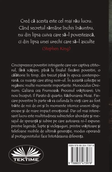 Cred c¿ acesta este cel mai r¿u lucru. Când secretul r¿mâne închis în¿untru, nu din lipsa cuiva care s¿-l povesteasc¿, ci din lipsa unei urechi care s¿-l asculte Stephen King Cincisprezece povestiri intrigante care vor captiva cititorul, f¿r¿ sc¿pare, pân¿ la finalul fiec¿rei povestiri, o c¿l¿torie în timp, din trecut pân¿ în epoca contemporan¿, cu nuan¿e care ating noir-ul. În aceast¿ colec¿ie se reg¿sesc multe momente importante: Monoculus Orsinum; Galiana cea Frumoas¿; Procesul vr¿jitoarei; Un nou început; Il Parato di quarto; R¿zbunarea Moai. Fiecare povestire în parte v¿ va cufunda în vie¿i care au fost tr¿ite de mii de ori ¿i în momente istorice uneori sângeroase ¿i de mare impact emöional. Dar cel mai interesant lucru este multitudinea subiectelor abordate ¿i mesajul de speran¿¿ ¿i iubire pe care autoarea ni-l expune: printre legende, lupte ¿i vicle¿uguri, printre vr¿jitoare ¿i telefoane mobile de ultim¿ generäie, modus operandi al protagonistului face întotdeauna diferen¿a.