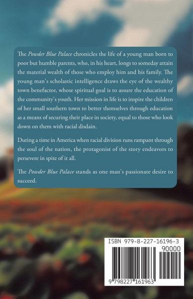 The Powder Blue Palace chronicles the life of a young man born to poor but humble parents, who, in his heart, longs to someday attain the material wealth of those who employ him and his family. The young man's scholastic intelligence draws the eye of the wealthy town benefactor, whose spiritual goal is to assure the education of the community's youth. Her mission in life is to inspire the children of her small southern town to better themselves through education as a means of securing their place in society, equal to those who look down on them with racial disdain. During a time in America when racial division runs rampant through the soul of the nation, the protagonist of the story endeavors to persevere in spite of it all. The Powder Blue Palace stands as one man's passionate desire to succeed.