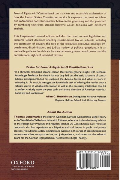 Power and Rights in US Constitutional Law is a clear, accessible explanation of how the Constitution works. The book combines expert commentary with excerpts from key Supreme Court decisions, providing an authentic and engaging overview of the key principles, such as Right of Privacy, Freedom of Speech, and Equal Protection. The revised Second Edition also includes discussion of today's most urgent constitutional issues, such Separation of Powers, the Roleof the Executive, Executive Privilege, Impeachment, and Judicial Review of Political Questions. Written by a highly regarded law professor and trial lawyer, Power and Rights in US Constitutional Law is appropriate both for a general audience as well as for courses in Law and Politics.