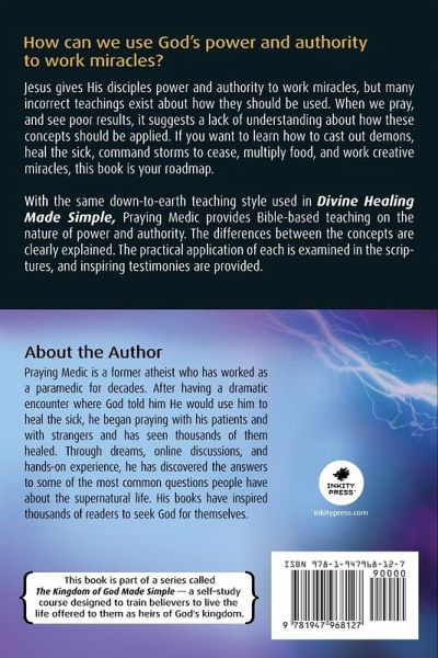 How can we use God's power and authority to work miracles? Jesus gives His disciples power and authority to work miracles, but many incorrect teachings exist about how they should be used. When we pray and see poor results, it suggests a lack of understanding about how these concepts should be applied. If you want to learn how to cast out demons, heal the sick, command storms to cease, multiply food, and work creative miracles, this book is your roadmap. With the same down-to-earth teaching style used in Divine Healing Made Simple, Praying Medic provides Bible-based teaching on the nature of power and authority. The differences between the concepts are clearly explained. The practical application of each is examined in the scriptures, and inspiring testimonies are provided. Topics covered:Sovereign miracles and man's use of authority Releasing power to work creative miracles Exercising authority to remove demons Exercising authority for healing Authority over weather Food multiplication Faith for miracles The gift of faith God's presence Raising the dead Emotional healing Authority to bless Authority to break curses Finding your divine destiny When healing doesn't happen Supernatural repair of electronic devices