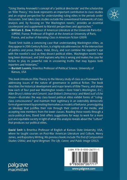 This book introduces Elite Theory to the literary study of class as a framework for addressing issues of the nature of governance in political fiction. The book describes the historical development and major tenets of Elite Theory, and shows how each of four post-war Washington novels-Gore Vidal's Washington, D.C.; Allen Drury's Advise and Consent; Joan Didion's Democracy; and Ward Just's Echo House-illustrates the way class-based political elites exhibit forms of "ruling-class consciousness" and maintain their legitimacy in an ostensibly democratic form of government by promoting themselves as models of behavior, promulgating an ideology that justifies their rule through their control of the media, and accepting new members from the lower classes. Reading these novels through a socio-political lens, David Smit offers suggestions for ways to work for a more just and equitable society in light of what this analysis reveals about the "culture" that produces our political elites.