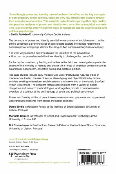The concepts of power and identity are vital to many areas of social research. In this edited collection, a prominent set of contributors explore the double relationship between power and group identity, focusing on two complementary lines of enquiry: In what ways can the powerful dictate the identities of the powerless? How can the powerless redefine their identity to challenge the powerful? Each chapter is written by leading authorities in the field, and investigates a particular aspect of the interplay of identity and power via a range of empirical contexts such as colonialism, nationalism, collective action, and electoral politics. The case studies include early modern Goa under Portuguese rule, the tribes of modern-day Jordan, the use of sexual stereotyping and objectification by female activists seeking to transform social systems, and a revisiting of the classic Stanford Prison Experiment. The chapters include contributions from a variety of social disciplines and research methodologies, and together provide a comprehensive overview of a subject at the cutting-edge of social and political psychology. Power and Identity will be of great interest to researchers, graduates and upper-level undergraduate students from across the social sciences.