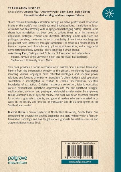 This book provides a social interpretation of written South African translation history from the seventeenth century to the present, considering how trends involving various languages have reflected ideologies and unequal power relations and focusing attention on translation's often hidden social operation. Translation is investigated in relation to colonial mercantilism, scientific knowledge of extraction, Christian missionary conversion, Islamic education, various nationalisms, apartheid oppression and the anti-apartheid struggle, neoliberalism, exclusion and post-apartheid social transformation by employing Niklas Luhmann's social systems theory. This book will be an essential resource for scholars, graduate students, and general readers who are interested in or work on the history and practice of translation and its cultural agents in the South African context.