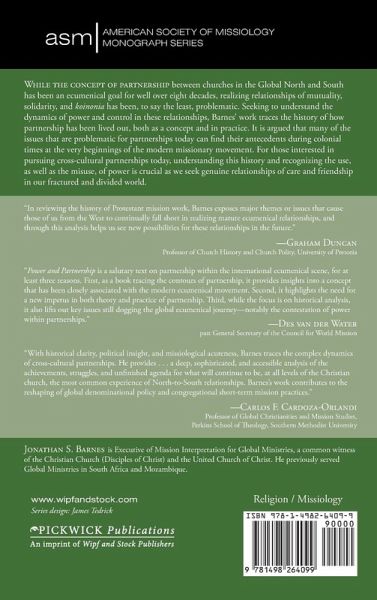 Description: While the concept of partnership between churches in the Global North and South has been an ecumenical goal for well over eight decades, realizing relationships of mutuality, solidarity, and koinonia has been, to say the least, problematic. Seeking to understand the dynamics of power and control in these relationships, this work traces the history of how partnership has been lived out, both as a concept and in practice. It is argued that many of the issues that are problematic for partnerships today can find their antecedents during colonial times at the very beginnings of the modern missionary movement. For those interested in pursuing cross-cultural partnerships today, understanding this history and recognizing the use, as well as the misuse, of power is crucial as we seek genuine relationships of care and friendship in our fractured and divided world. Endorsements: ""In reviewing the history of Protestant mission work, Barnes exposes major themes or issues that cause those of us from the West to continually fall short in realizing mature ecumenical relationships, and through this analysis helps us see new possibilities for these relationships in the future."" --Graham Duncan, Professor of Church History and Church Polity, University of Pretoria ""Power and Partnership is a salutary text on partnership within the international ecumenical scene, for at least three reasons. First, as a book tracing the contours of partnership, it provides insights into a concept that has been closely associated with the modern ecumenical movement. Second, it highlights the need for a new impetus in both theory and practice of partnership. Third, while the focus is on historical analysis, it also lifts out key issues still dogging the global ecumenical journey--notably the contestation of power within partnerships."" --Des van der Water, past General Secretary of the Council for World Mission ""With historical clarity, political insight, and missiological acuteness, Barnes traces the complex dynamics of cross-cultural partnerships. He provides . . . a deep, sophisticated, and accessible analysis of the achievements, struggles, and unfinished agenda for what will continue to be, at all levels of the Christian church, the most common experience of North-to-South relationships. Barnes's work contributes to the reshaping of global denominational policy and congregational short-term mission practices."" --Carlos F. Cardoza-Orlandi, Professor of Global Christianities and Mission Studies, Perkins School of Theology, Southern Methodist University About the Contributor(s): Jonathan Barnes is Executive of Mission Interpretation for Global Ministries, a common witness of the Christian Church (Disciples of Christ) and the United Church of Christ. He previously served Global Ministries in South Africa and Mozambique.