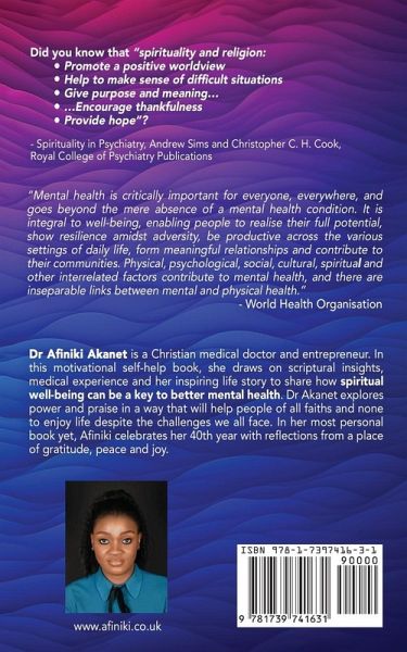 Did you know that "spirituality and religion: Promote a positive worldview Help to make sense of difficult situations Give purpose and meaning... ...Encourage thankfulness Provide hope"? Spirituality in Psychiatry, Andrew Sims and Christopher C. H. Cook Royal College of Psychiatry Publications In this motivational self-help book, Dr Akanet draws on scriptural insights, medical experience and her inspiring life story to share how spiritual well-being can be a key to better mental health. She explores power and praise in a way that will help people of all faiths and none to enjoy life in spite of the challenges we all face. In her most personal book yet, Afiniki celebrates her 40th year with reflections from a place of gratitude, peace and joy. #popping40 "Mental health is critically important for everyone, everywhere, and goes beyond the mere absence of a mental health condition. It is integral to well-being, enabling people to realize their full potential, show resilience amidst adversity, be productive across the various settings of daily life, form meaningful relationships and contribute to their communities. Physical, psychological, social, cultural, spiritual and other interrelated factors contribute to mental health, and there are inseparable links between mental and physical health." - World Health Organisation "A supremely practical and useful book. Original, palatable, and honest advice based on lived experiences, by a trained professional" - Arup Roy, Lead Surface Design Engineer "Niki writes in a lovely conversational style that makes it sound like a conversation with a friend. The book offers insight into the worldview of the author and how it shapes even the smallest decisions and experiences in her life. It challenges the reader to view life from a different perspective and encourages reflection on what is important. It is hopeful and encouraging in its tone. Power and Praise is worth a read." - Zainab Oseni, General Practitioner (GP) with a special interest in global health "In this book, Niki gives so many anecdotes of situations/problems she has encountered in her life, followed by extremely helpful suggestions of how she overcame them...Niki is such a prolific writer that once you start reading this or any of her other books they are hard to put down until you reach the end. I highly recommend this book." - Margaret Greenway, Retired administrator