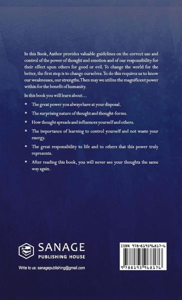 In this Book, Author provides valuable guidelines on the correct use and control of the power of thought and emotion and of our responsibility for their effect upon others for good or evil. To change the world for the better, the first step is to change ourselves. To do this requires us to know our weaknesses, our strengths. Then may we utilize the magnificent power within for the benefit of humanity. In this book you will learn about... - The great power you always have at your disposal. - The surprising nature of thought and thought-forms. - How thought spreads and influences yourself and others. - The importance of learning to control yourself and not waste your energy. - The great responsibility to life and to others that this power truly represents. After reading this book, you will never see your thoughts the same way again