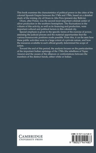 This book examines the characteristics of political power in the cities of the colonial Spanish Empire between the 1740s and 1780s, based on a detailed study of the mining city of Oruro in Alto Peru (present-day Bolivia). Oruro, after Potosi, was the second most important colonial center of silver production in the southern hemisphere. The fluctuations in the volume of this activity, as well as its financing and production, were important cultural and political factors in this colonial city. The author gives special emphasis to the specific forms of the exercise of power, assessing the judicial process and the material opportunities that the various bureaucratic positions made possible. From this, it can be seen how these public activities were to a large extent of a private nature, and how the resources available to each official greatly determined his scope of action. Toward the end of this period, the analysis focuses on the important Indian uprisings of the 1780s (the rebellions of Tupac Amaru) and the causes of the alliances or confrontations between the members of the distinct bands, either white or Indian. These episodes are of particular interest because some aspects of the present guerrilla activity in Peru by the Shining Path can be seen in the insurrections of the 1780s.