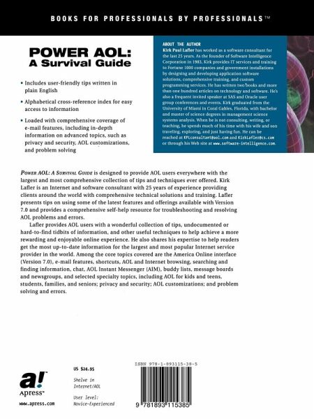 Power AOL is designed to provide the tens of millions of AOL users everywhere with the largest and most comprehensive collection of AOL tips and techniques ever offered. Kirk Lafler is an Internet and software consultant with 25 years of experience providing clients around the world with comprehensive technical solutions and training. As such, he is uniquely poised to teach the users of the world's largest and most popular Internet Service provider the most effective use of this powerful online service. Lafler also presents tips on using some of the latest features and offerings available with Version 6.0. A later section in the book provides a comprehensive self-help resource for troubleshooting and resolving AOL problems and errors. Lafler's book provides AOL users with a wonderful collection of tips, undocumented or hard-to-find tidbits of information, and other useful techniques to help achieve a more rewarding and enjo
